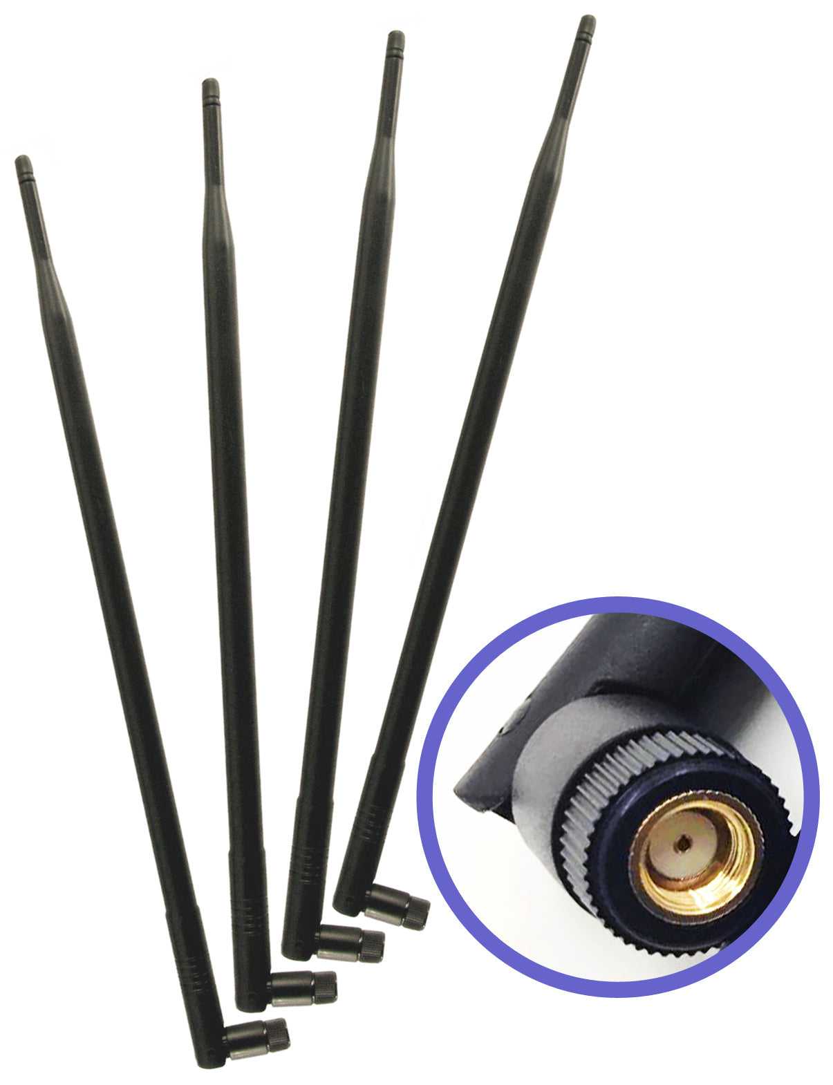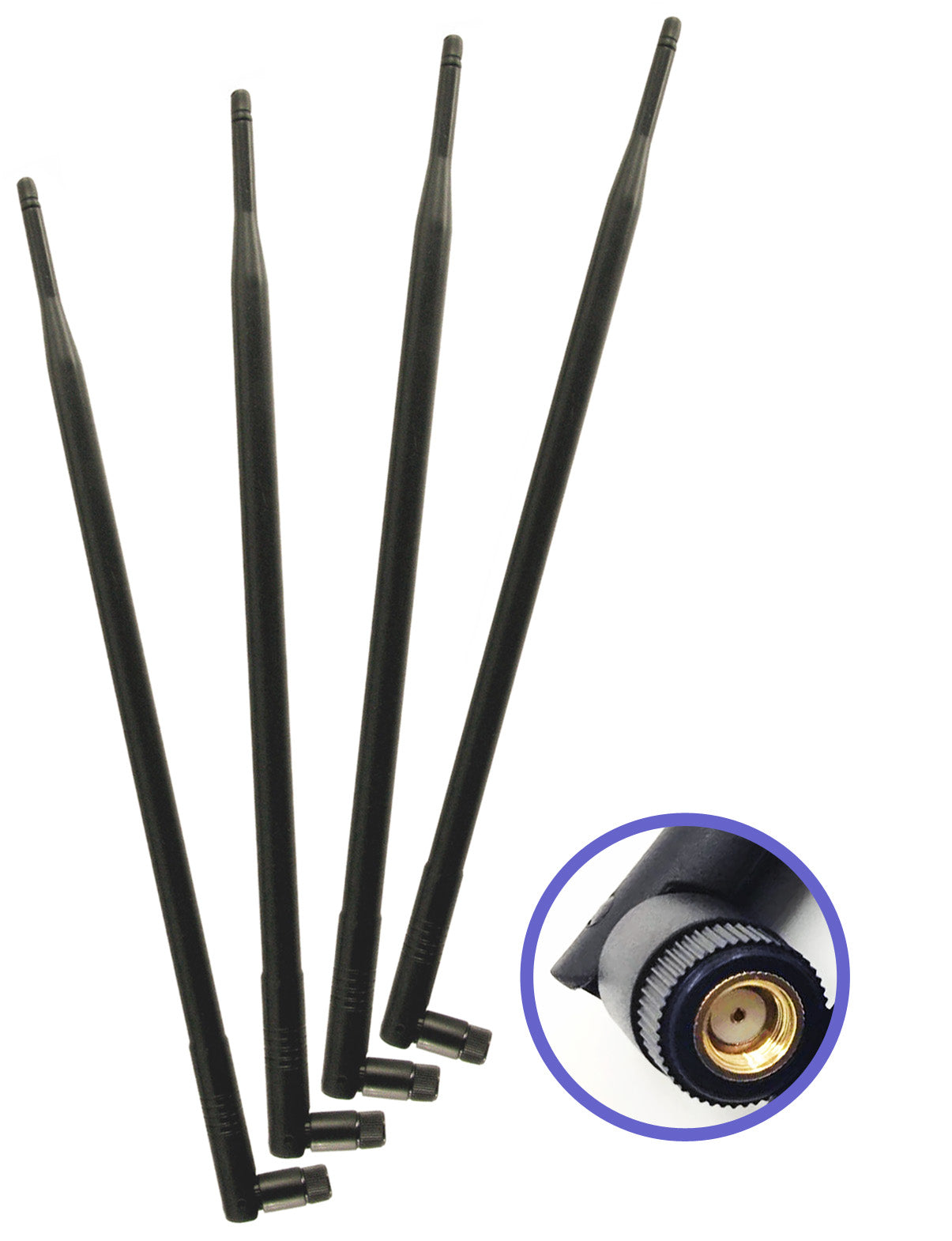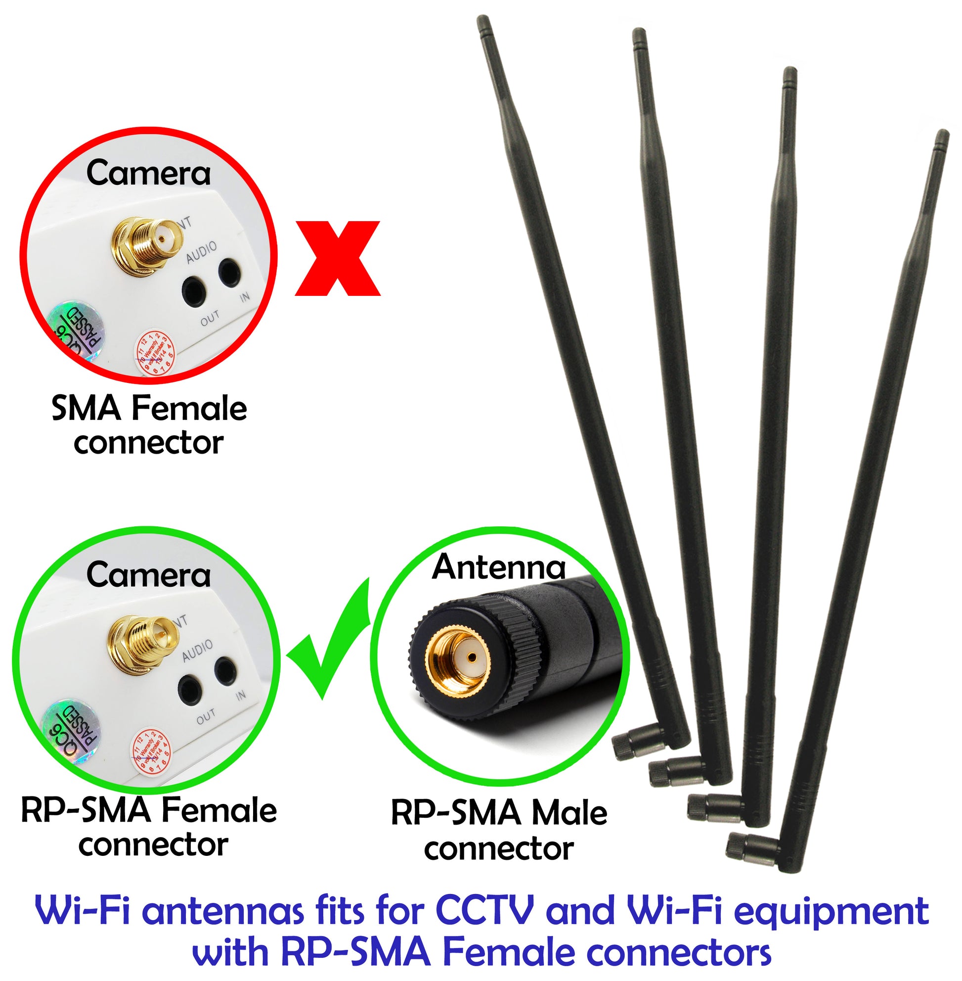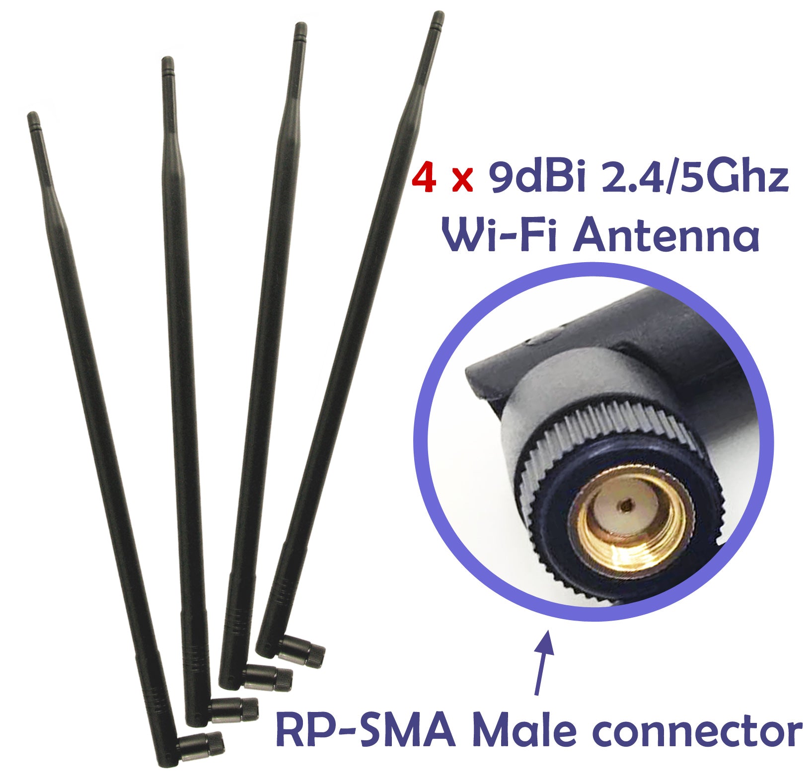 Your CCTV system does not work as it should and you didn’t expect such bad result from your wireless IP cameras?<br> We have a confident solution to this technical problem!<br>Now a large distance between Wi-Fi wireless equipment, dependence on the weather, radio interference and a weak Wi-Fi signal in the past. Our Wi-Fi 9dBi dual-band antennas kit will significantly increase the range and strength of your Wi-Fi signal and save you from dead spots. <br> Our omni-directional dual-band Wi-Fi antennas are a direct replacement for factory antennas that comes standard with your CCTV systems and IP video cameras. <br><br> EASY INSTALLATION - just twist off the factory antennas and twist on our more powerful Wi-Fi antennas. This screw-on, swivel mount RP-SMA Male connector is compatible with most wireless IP Cameras and NVRs with RP-SMA Female connectors.<br><br> SPECIFICATION:<br> - Product name: 2.4Ghz/5Ghz Dual Band Omni-Directional Wi-Fi Antenna (HSA-2458TE9)<br> - Gain/Frequency Range: 9dBi / 2.4Ghz & 5Ghz<br> - Polarization/Direction: Linear Vertical/ Omni-directional<br> - VSWR: ≤ 2.0<br> - Impedance: 50 Ohm nominal<br> - Connector type: RP-SMA Male (thread inside the hole in the center)<br> - Each antenna dimensions: 15.3in (390mm) x 0.6in (15mm)<br> - Operating temperature: -20°С ~ + 60°С<br> - Operating Humidity: 0% to 85% (non-condensing)<br> - Color: Black<br><br> PACKAGE INCLUDES: 4pcs of 9dBi 2.4Ghz/5Ghz Dual Band Omni Directional Wi-Fi Antenna with RP-SMA Male Connector For IP Camera, CCTV Systems, NVR and Wireless Network Devices. <br> NOTE: Change ALL the antennas into our 9dBi antennas, if your CCTV equipment kit has more external Wi-Fi antennas