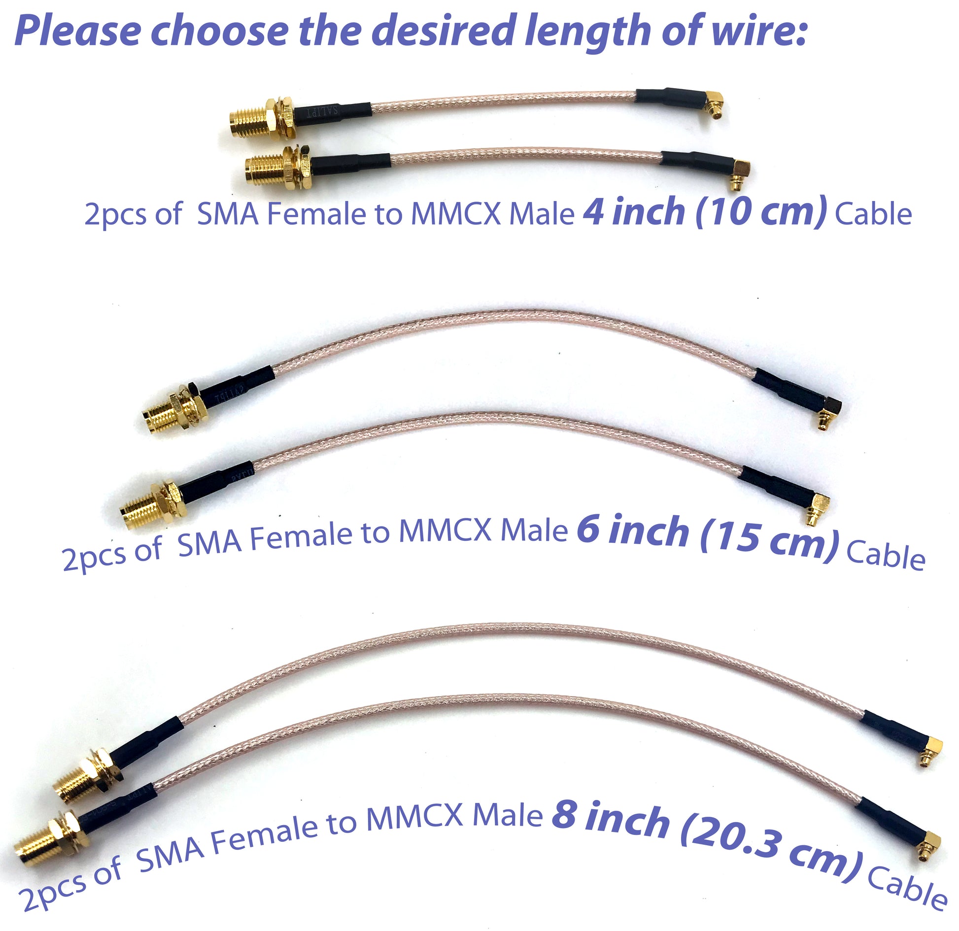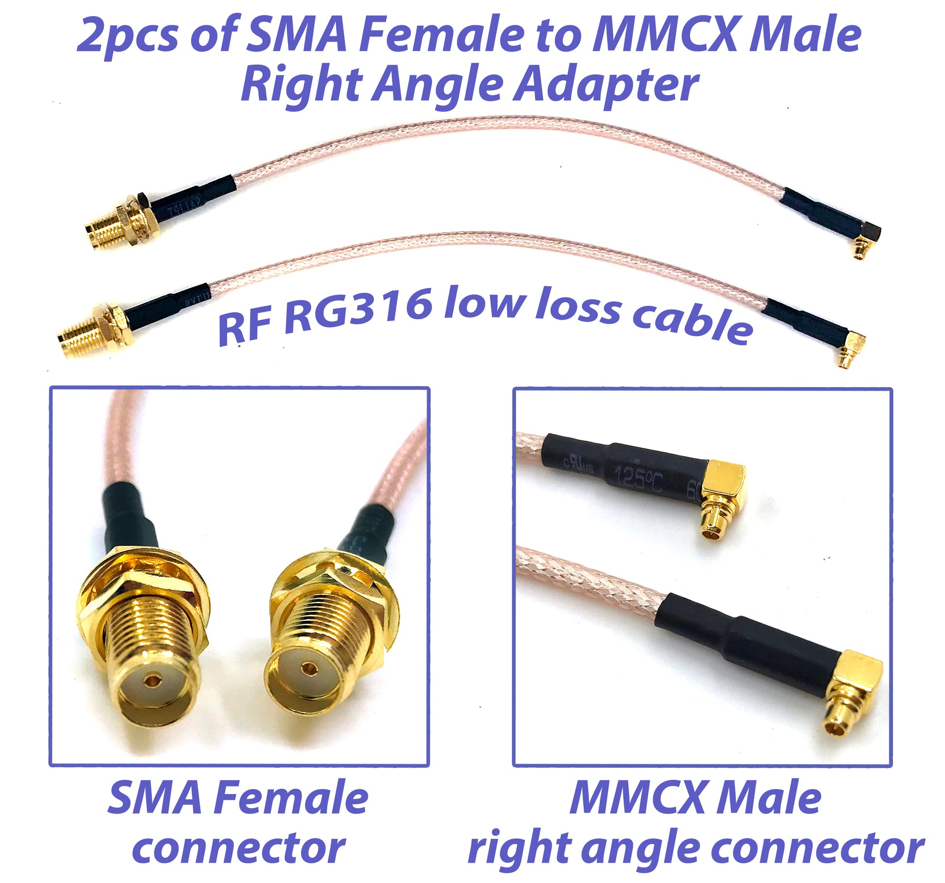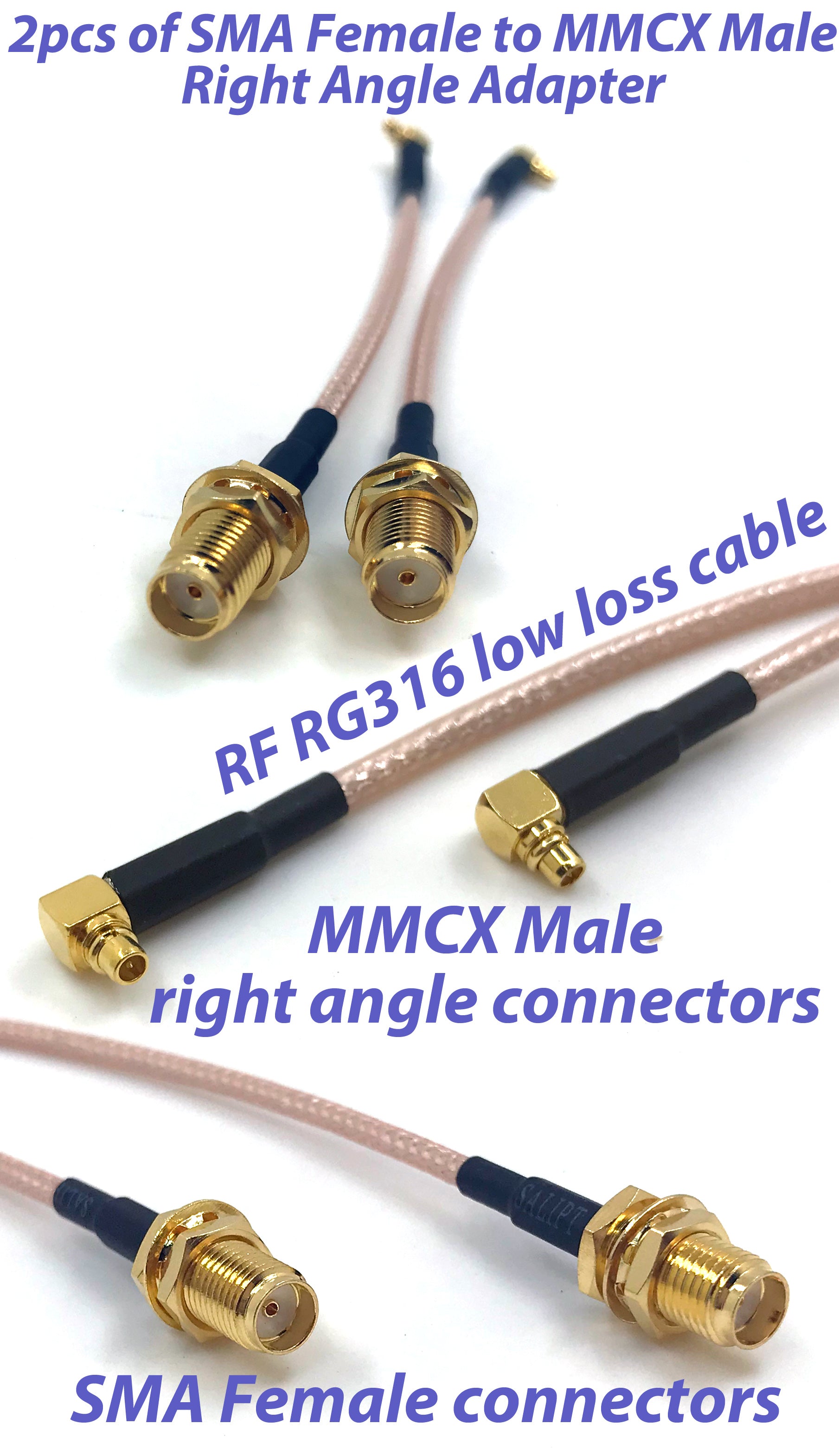 Pack of 2 of RF RG316 pigtail SMA female antenna connector to MMCX male Low Loss cable adapter right angle br><br> PRODUCT FEATURES: <br> - Product name : SMA female to MMCX male RG316 pigtail Low Loss cable;<br> - Connectors : SMA female to MMCX male; <br> - Cable type : Low Loss RG316 coaxial; <br> - Impedance : 50 Ω; <br> - Operating temperature : -40°С ~ +85°С; <br><br> PACKAGE INCLUDES: 2pcs of RF RG316 Coaxial pigtail Low Loss cable (SMA female to MMCX male)