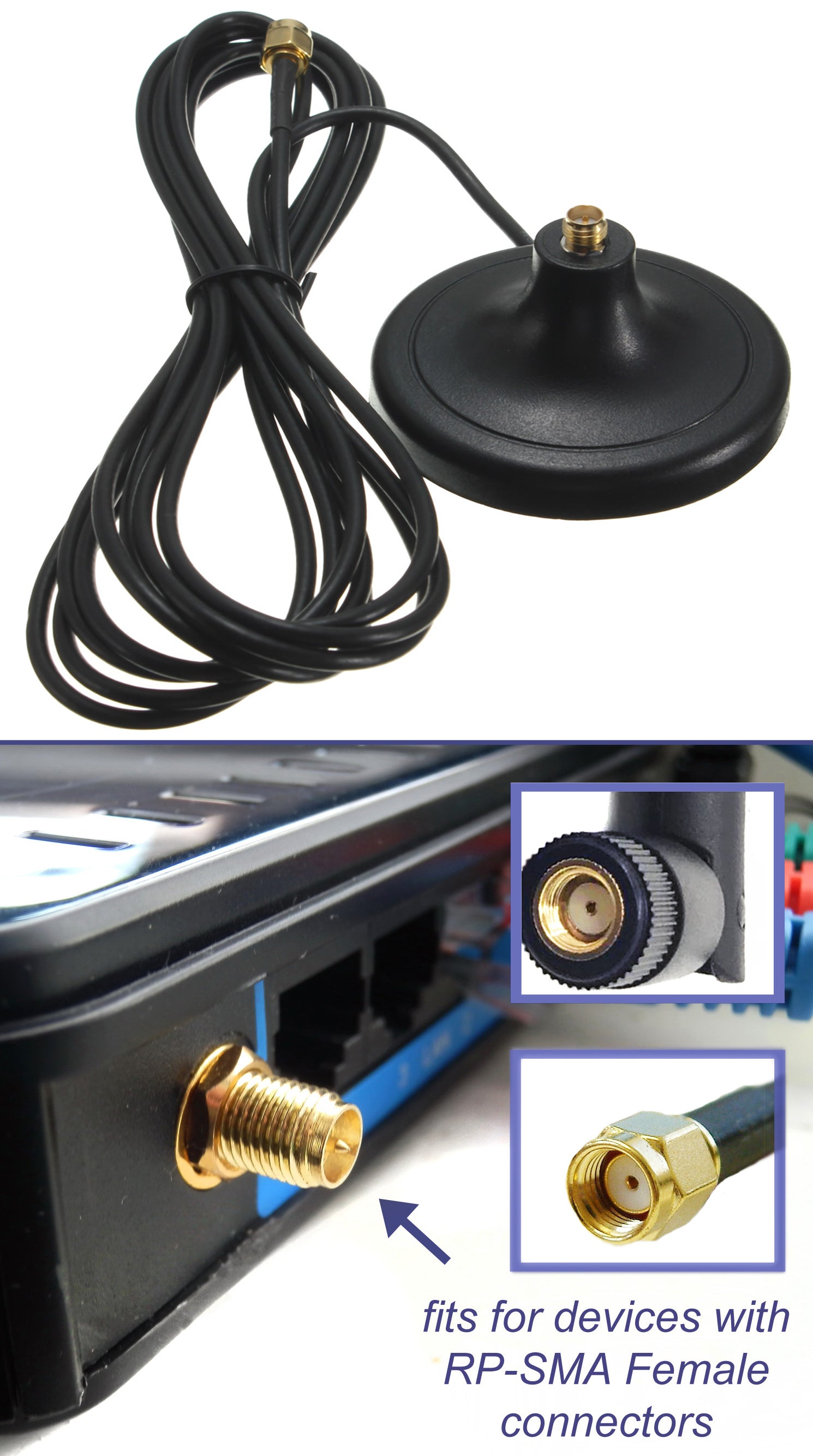 This Wi-Fi Antenna will significantly increase the range and strength of your Wi-Fi signal. <br> Our Omni-directional antenna is a direct replacement for the antenna that comes standard with your router, access point, VOIP device, or PCI card. <br> It is Omni-directional, no aiming is required - it can send and receive Wi-Fi in all directions. This antenna is STRONGER then the less powerful external wi-fi antennas offered by major manufacturers. <br><br> INSTALLATION IS VERY EASY - just twist off the factory antenna and twist on our more powerful Wi-Fi antenna and you'll experience an instant jump in. <br> Our Wi-Fi Antenna will WORK WITH ANY ROUTER or wireless Network adapter with RP-SMA Female connector. <br><br> PRODUCT FEATURES & SPECIFICATIONS: <br> - Product name / Product No. : 2.4Ghz-2.5Ghz External Wi-Fi Omni Directional Antenna / HSA-2400TF9B; <br> - Gain : 9dBi; <br> - Frequency Range : 2.4 Ghz - 2.5 Ghz; <br> - VSWR : ≤ 2.0; <br> - Polarization : Linear Vertical; <br> - Impedance : 50 Ω; <br> - Direction : Omni-directional; <br> - Connector : RP-SMA Male; <br> - Dimension-mm : 39 cm x 1,5 cm; <br> - Net Weight-g : 50; <br> - Operating temperature : -20°С ~ + 60°С; <br> - Storage temperature : -30°С ~ + 75°С; <br> - Operating Humidity : 0% to 85% (non-condensing); <br> - Cable length : 19,5 inches (0,5 m/50 cm); <br> - Cable type : RG174 Coaxial; <br> - Color : Black. <br><br> PACKAGE INCLUDES: 9dBi Gain Wi-Fi 2.4Ghz-2.5Ghz Omni Directional External Antenna on Magnetic base (with RP-SMA Male 1.65 ft cable)